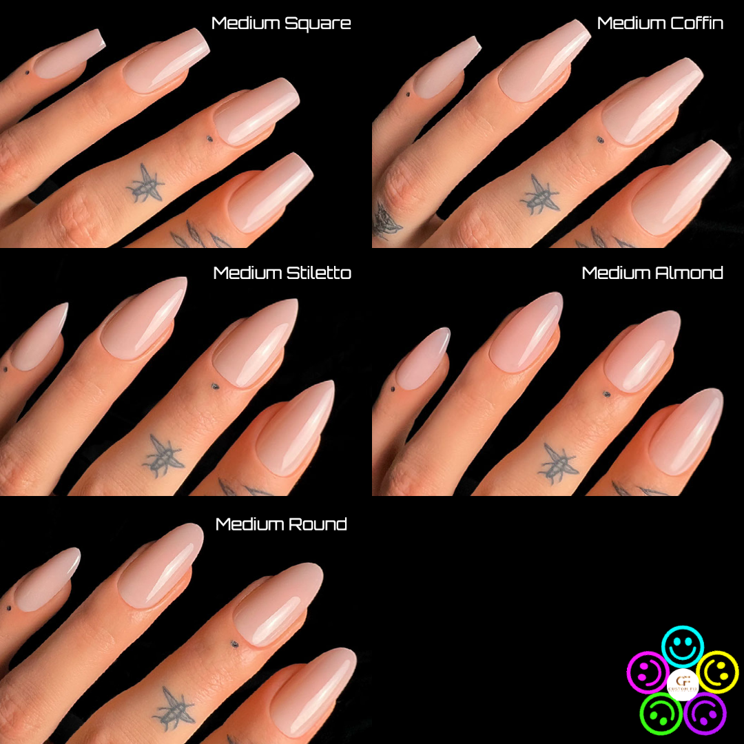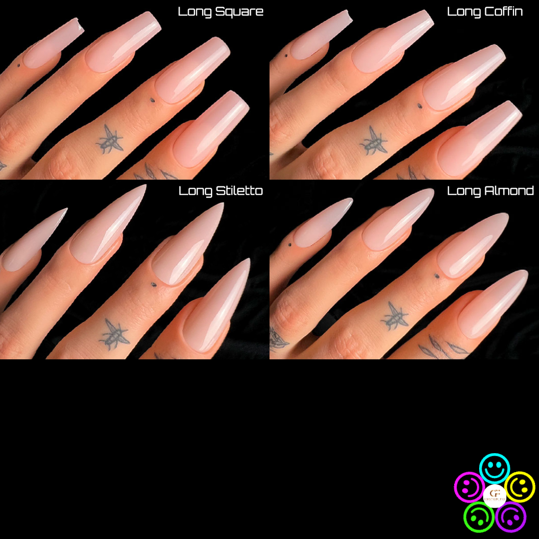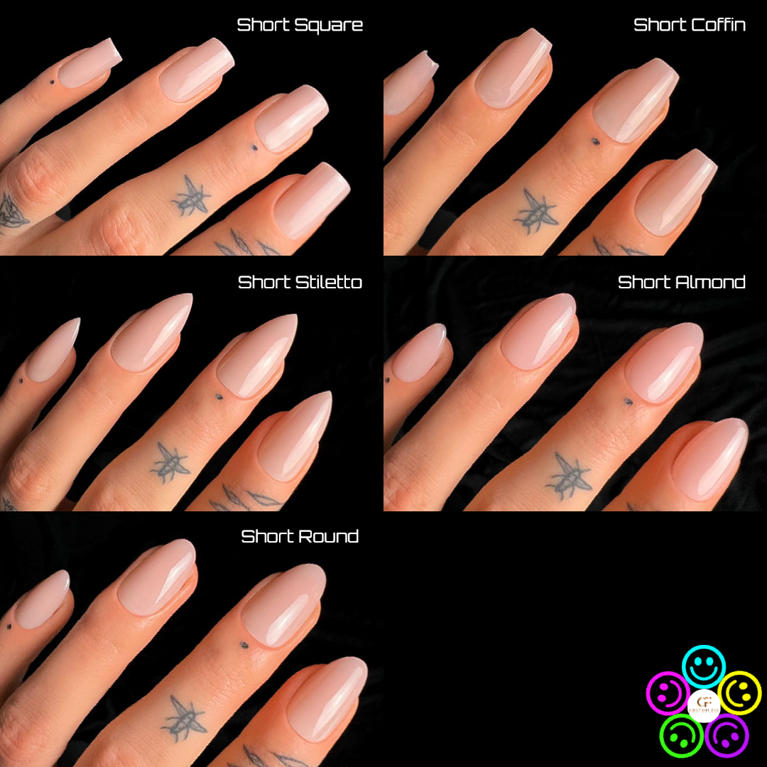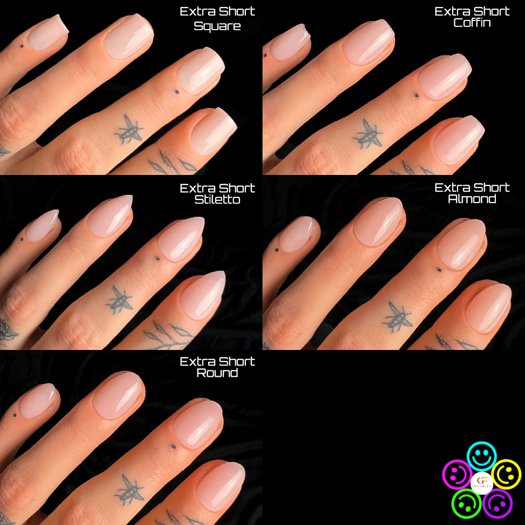 *Nails will appear slightly different in length depending on your natural nail bed. For example: In the photos you will notice the pointer nail extends farther past the finger (because it has a smaller nail bed) than the ring finger (having a longer nail bed). Extra Short will not fit everyone as they are, well, extra short.