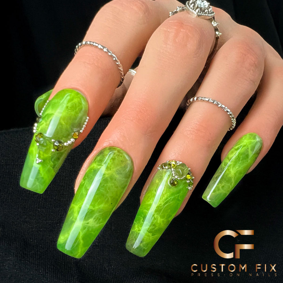 *Due to the added crystals, these nails may require a bit more care to maintain their sparkle. Such as, using a brush when washing your hands to remove any dirt that has gotten caught between crystal, gentle handling during application and removal is essential to prevent damage to the crystals, additionally, avoiding harsh chemicals and impact activities can help preserve the appearance.
