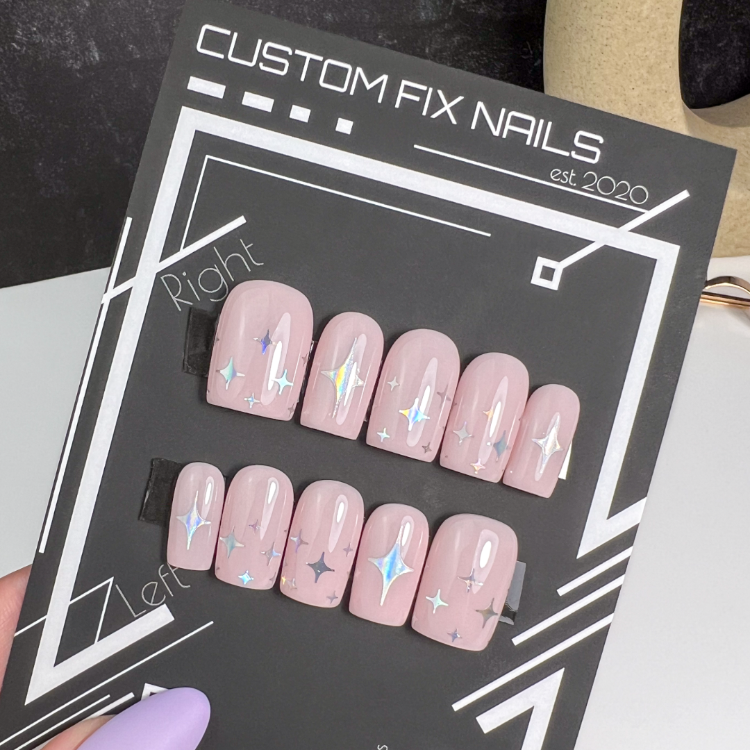 Talk about dreamy! So, imagine this: a soft, dreamy pink that's like a gentle whisper on your nails. And guess what? It's got this cool transparency that gives it that angelic vibe. But wait, it gets even better! Picture little holographic stars sprinkled on top, shimmering and catching the light in the most enchanting way. It's like having your own mini galaxy on your fingertips! Plus, you can totally make it your own by customizing the base color to match your style. So, ready to add some celestial magic to your look?