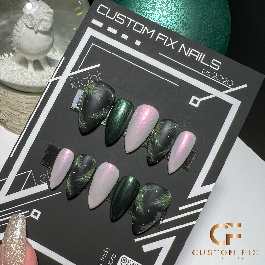 Dark and chic, everything we love! Such a striking dark shimmer green, dazzling opal pearl, and the sweetest little snow sprinkled branches. Like we said dark and chic, and just so perfect🥰