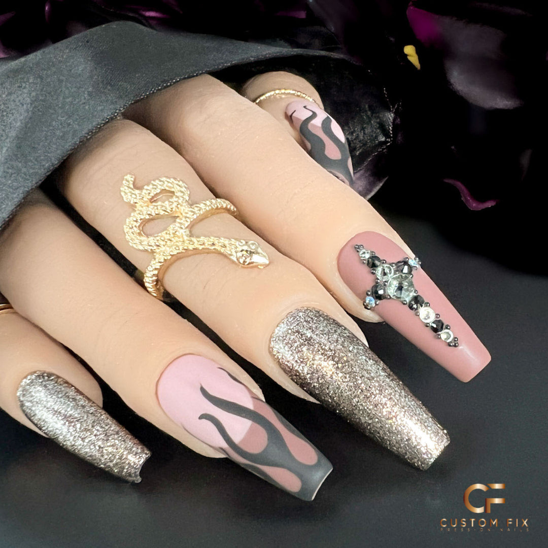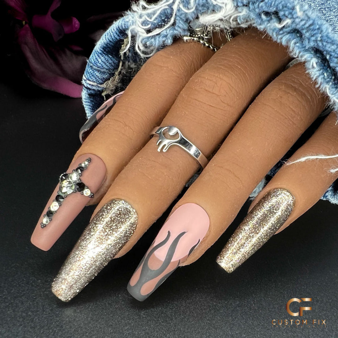 Talk about the raddest vibe! Our grunge dream come true. Rich mocha french with black flames, flaky brown glitter that is completely smooth to the touch but adds tons of texture and the raddest crystals cross. Dark, edgy, and and perfectly rad.