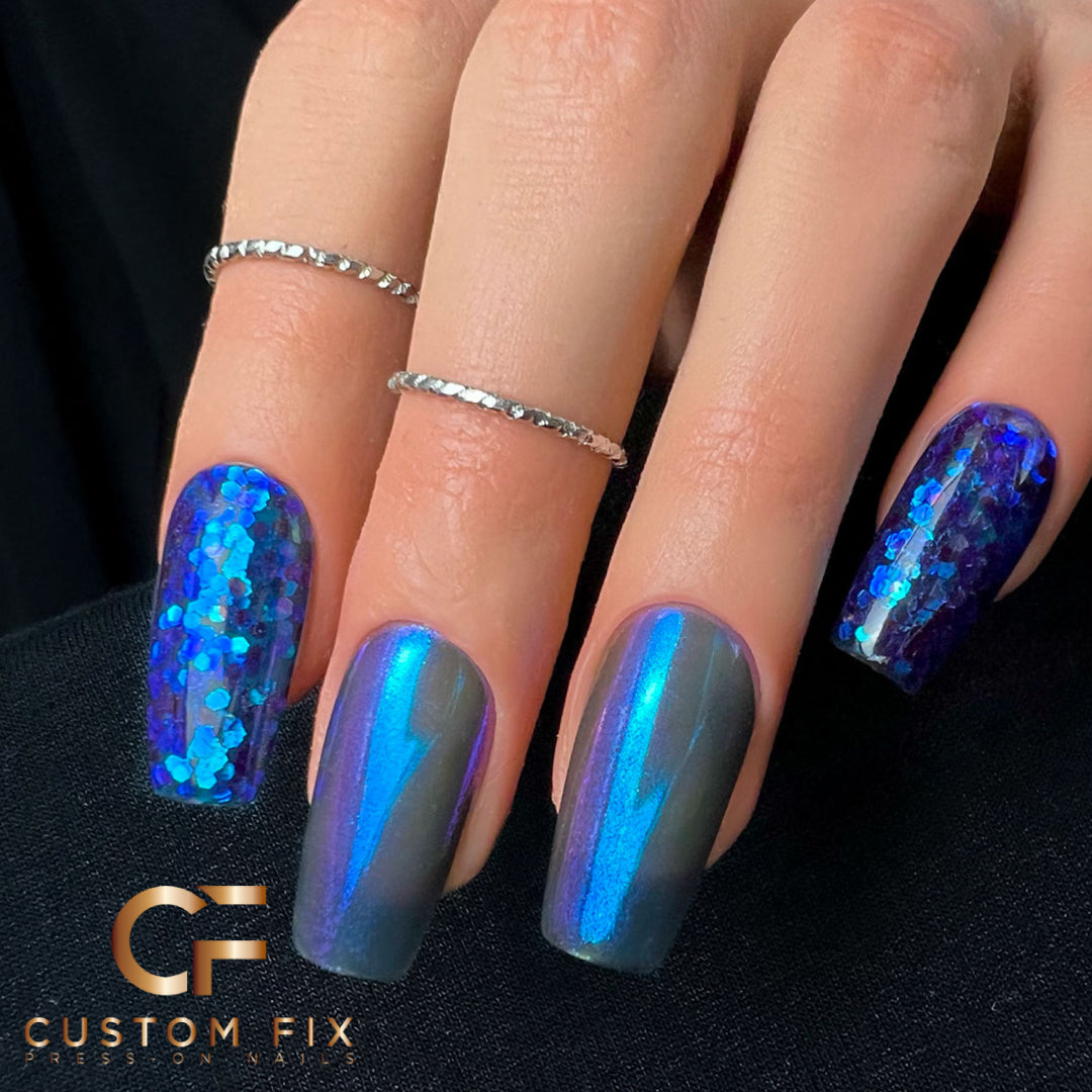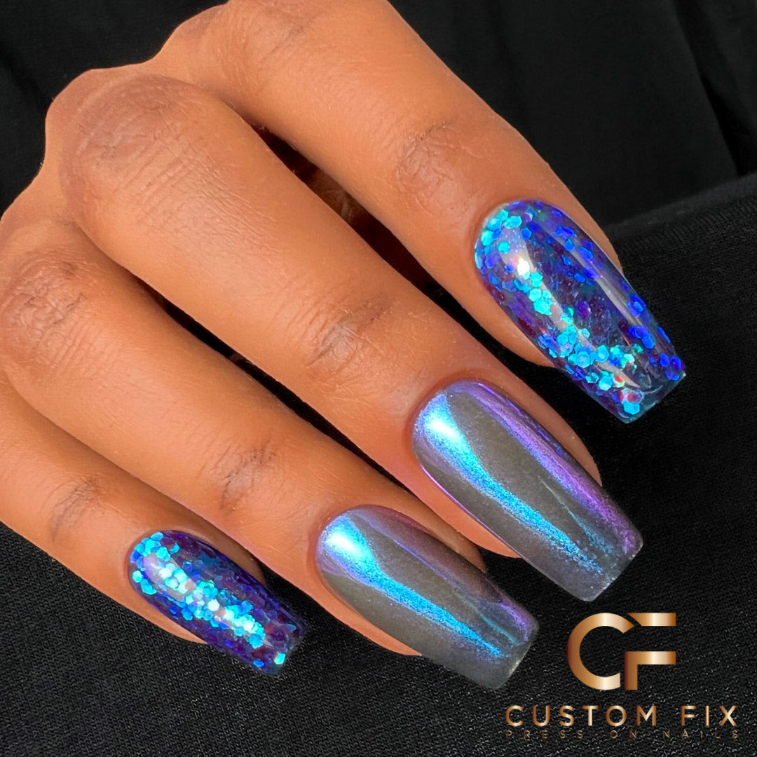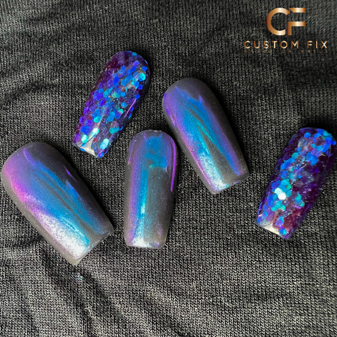 She is interesting, she follows her passions, she chooses herself first, she is MAGNETIC to the fullest! This Fix has all those feelings and more. The raddest glass black base with mesmerizing blue chrome. And let me tell you about that glitter! It's the coolest red iridescent glitter on top of a glass blue base giving it this insane finish!