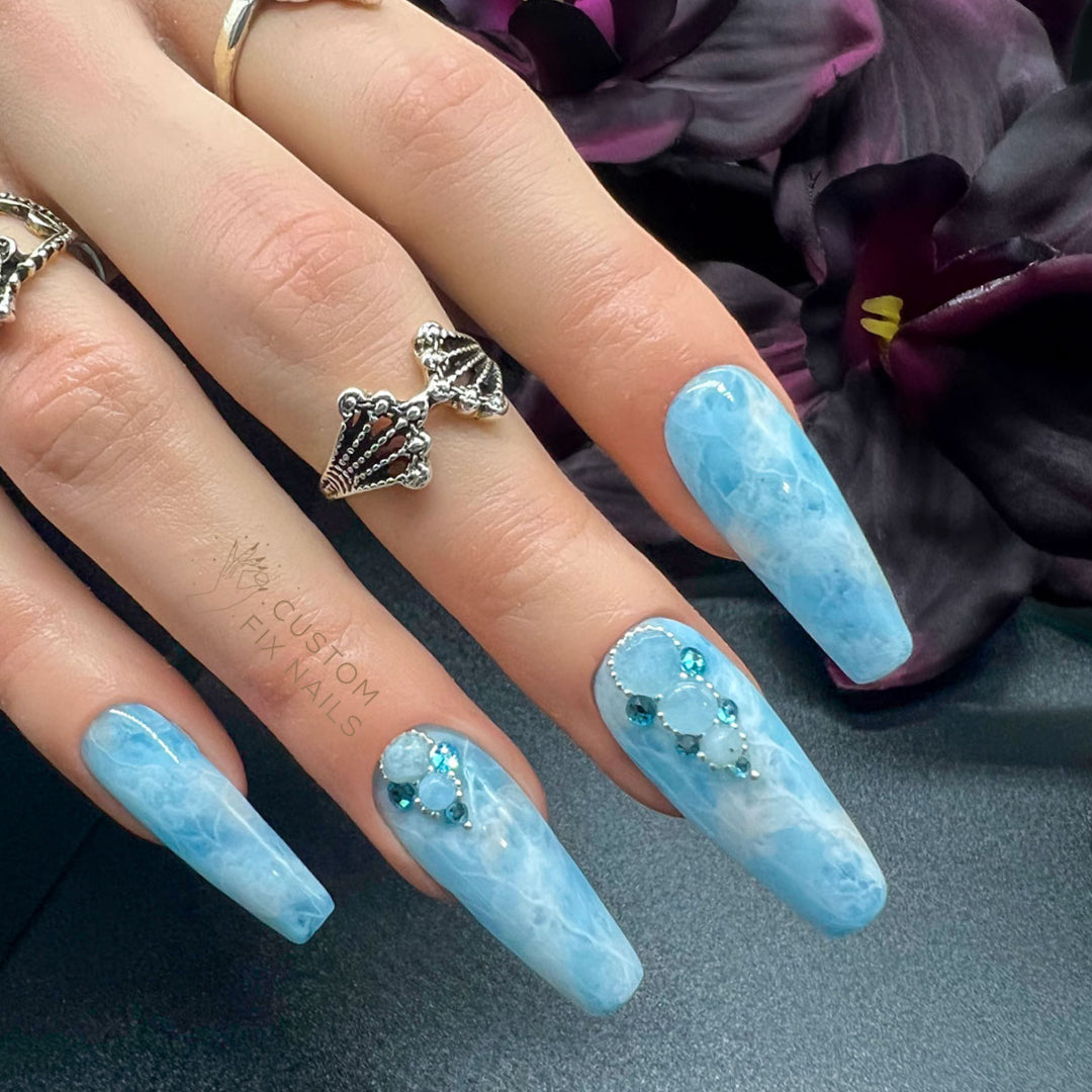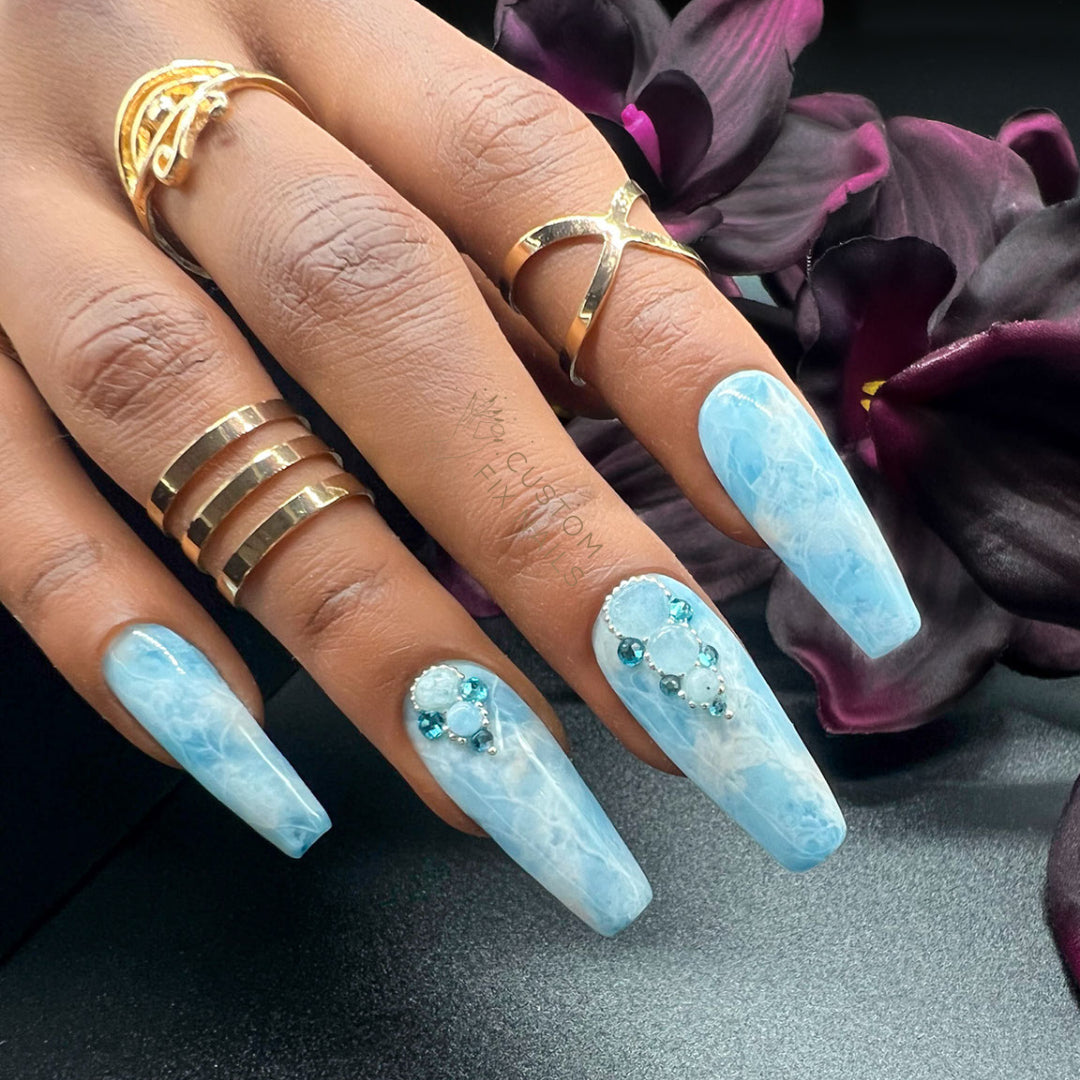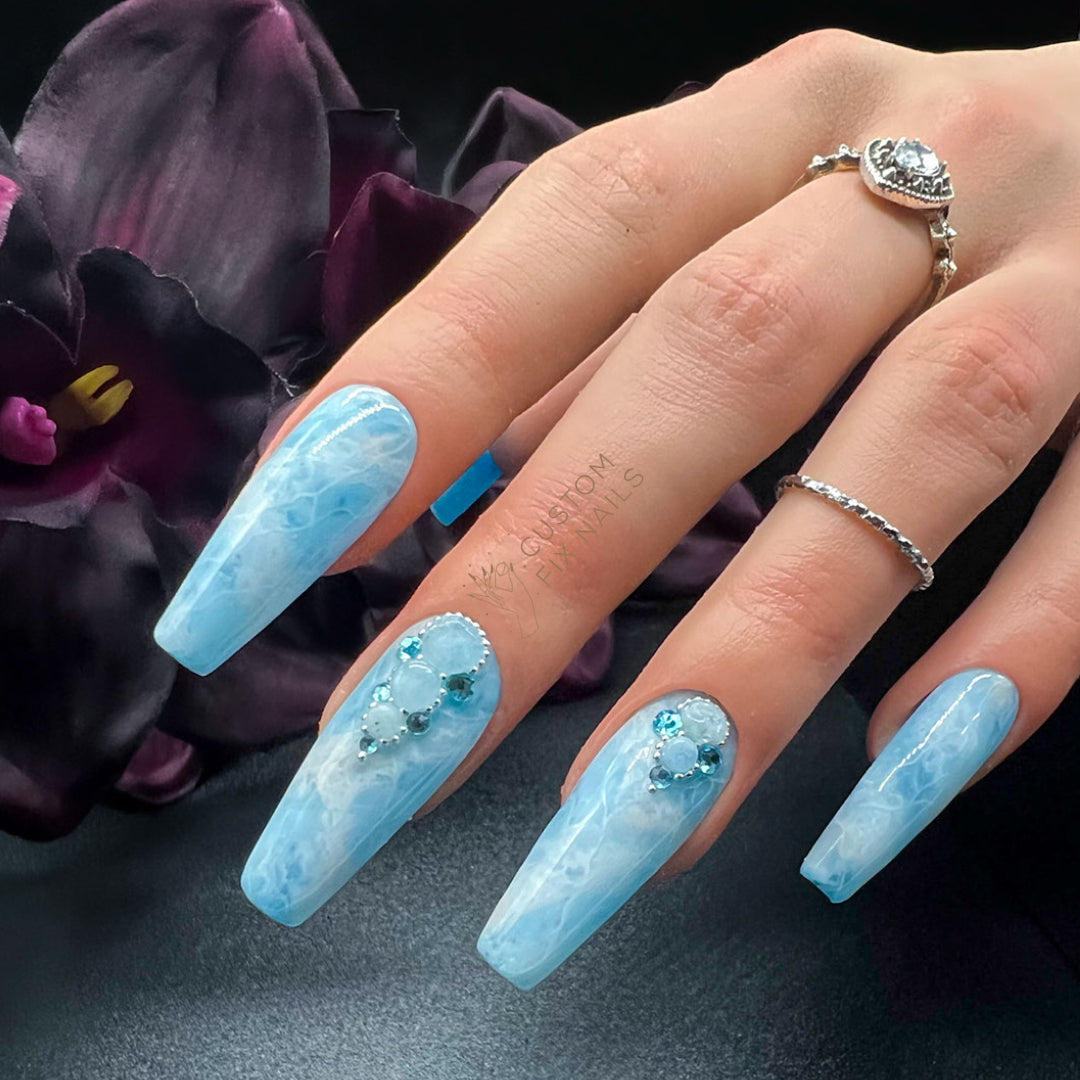 Aquamarine, with its name meaning "water of the sea," captures the essence of the gentle, soothing waves. While we can't promise miracles, we believe in the power of symbolism. These nails are crafted with the intention of evoking feelings of calmness and rejuvenation, much like a day spent by the ocean.