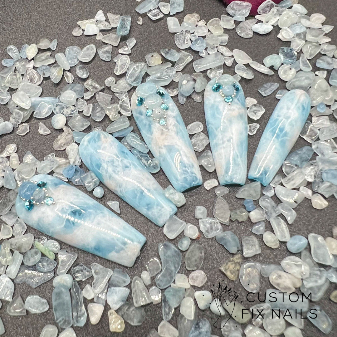Introducing our Custom Press-On Nails, inspired by March's birthstone, Aquamarine. But these nails aren't just about looks – they're designed to bring a touch of tranquility and inner strength to your fingertips.