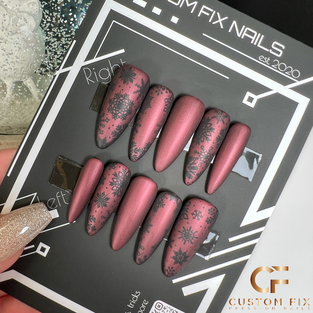 Holiday but make it edgy! Choose a matte topcoat to give that dreamy deep ruby a frosted look or choose gloss top coat to show off the shimmer. And those black snowflakes are just so rad, right?!