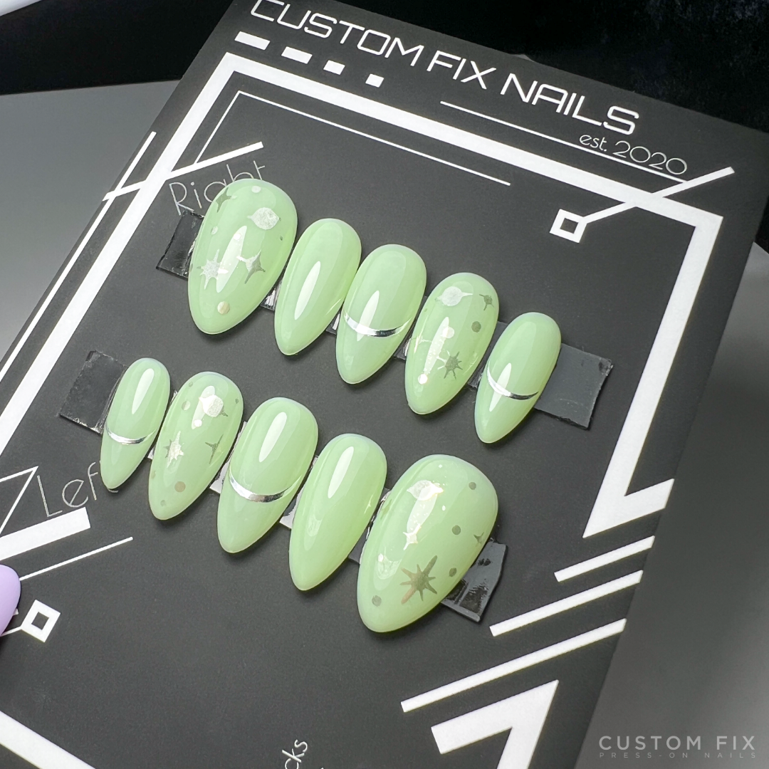 Check out the Orbit Fix – it's this dreamy set of soft milky green with cool chrome space details. Imagine having your fingertips in a galaxy of planets, stars, and rings. It brings the whole cosmos to your manicure! And the best part? These press-on nails make it super easy to get that out-of-this-world style anytime, anywhere no need for an appointment.