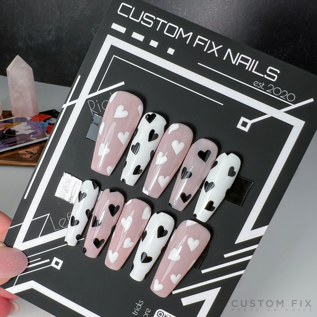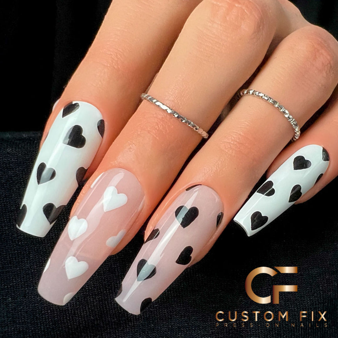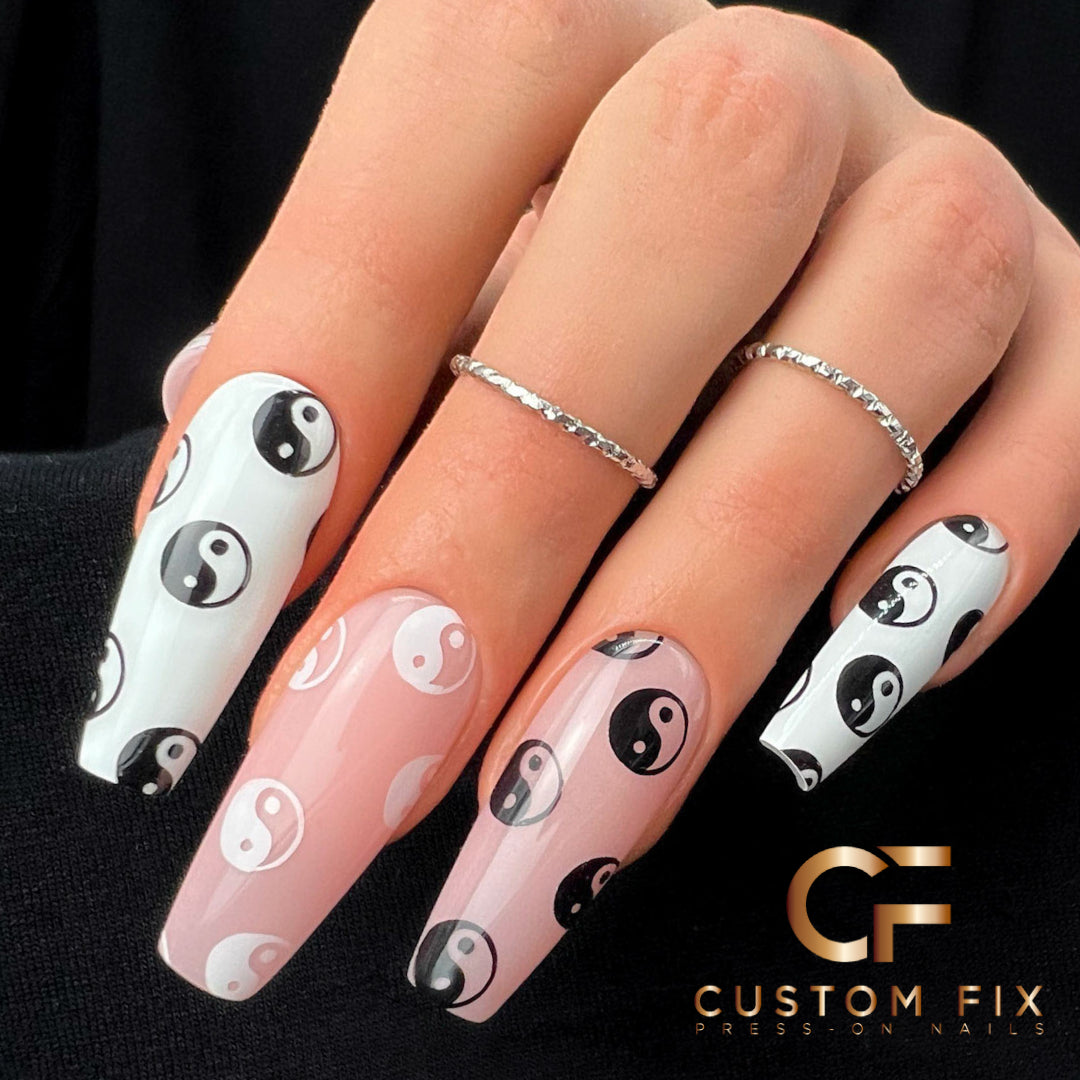 Introducing the Print Fix - a harmonious blend of classic black and white elegance paired with delectable nude tones. Choose your perfect nude match and personalize your set with charming prints: opt for playful Smiles, romantic Hearts, or embrace the balance with Yin & Yang.