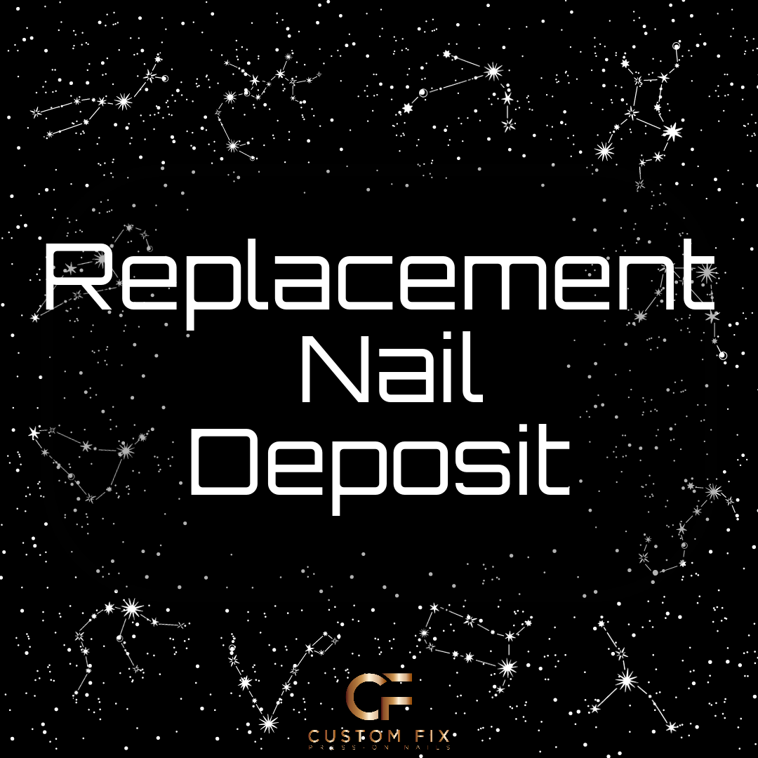 This deposit puts your name into the processing queue. Fill out the form under our Replacement Nail page and then purchase your deposit. The full amount of this deposit is credited toward the final cost of your replacement order. Once I have received your form and deposit, I will contact you with any questions I may have on your set, verify your place in the queue and an estimate on completion date.