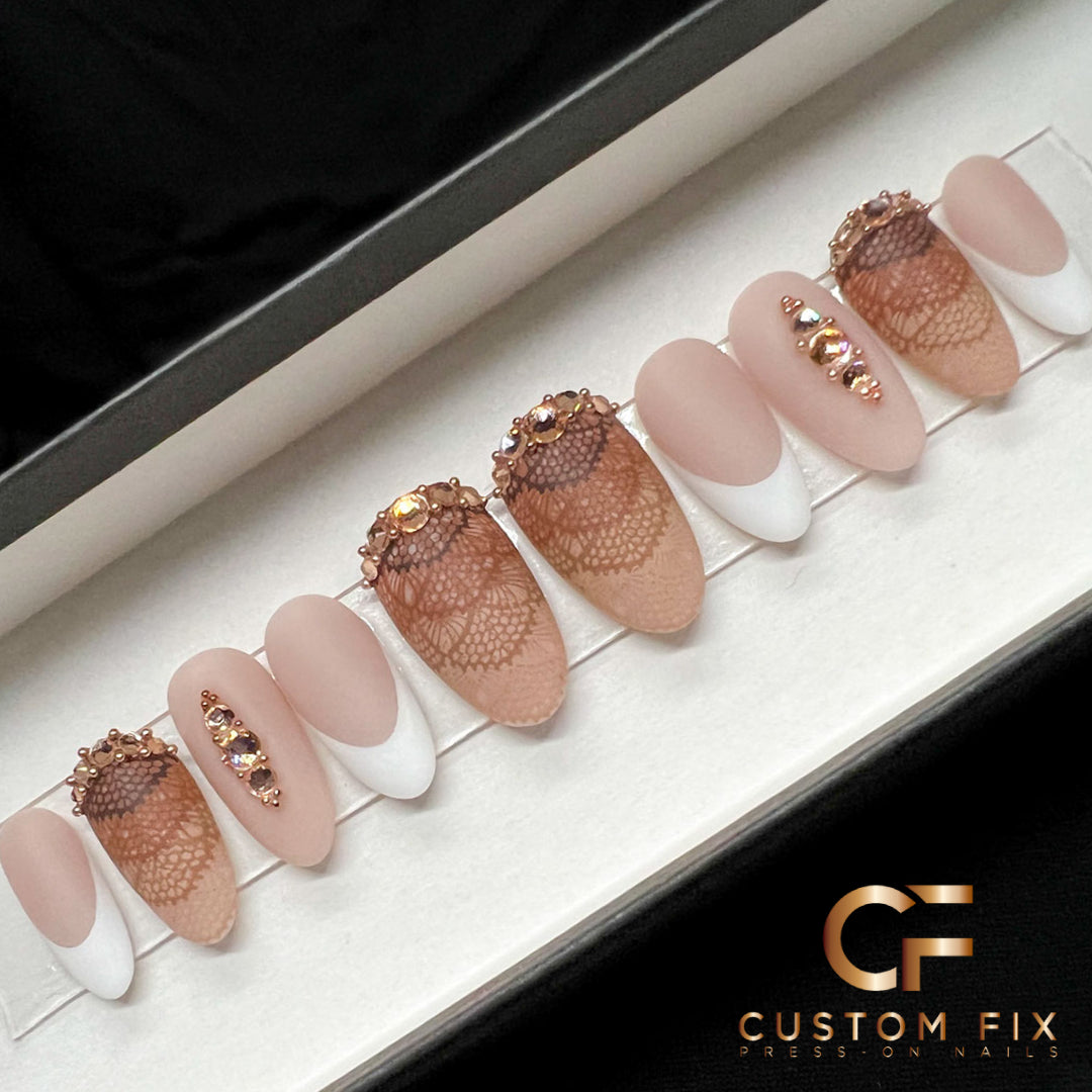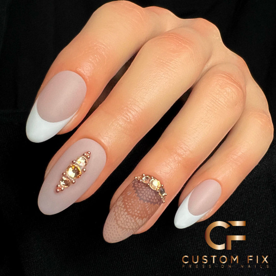 Absolutely in LOVE with how chic and pretty this Fix is! A stunning lace ombre crowned with champagne crystals--we can't get over it either! Paired with a classic (for a reason!) white french.