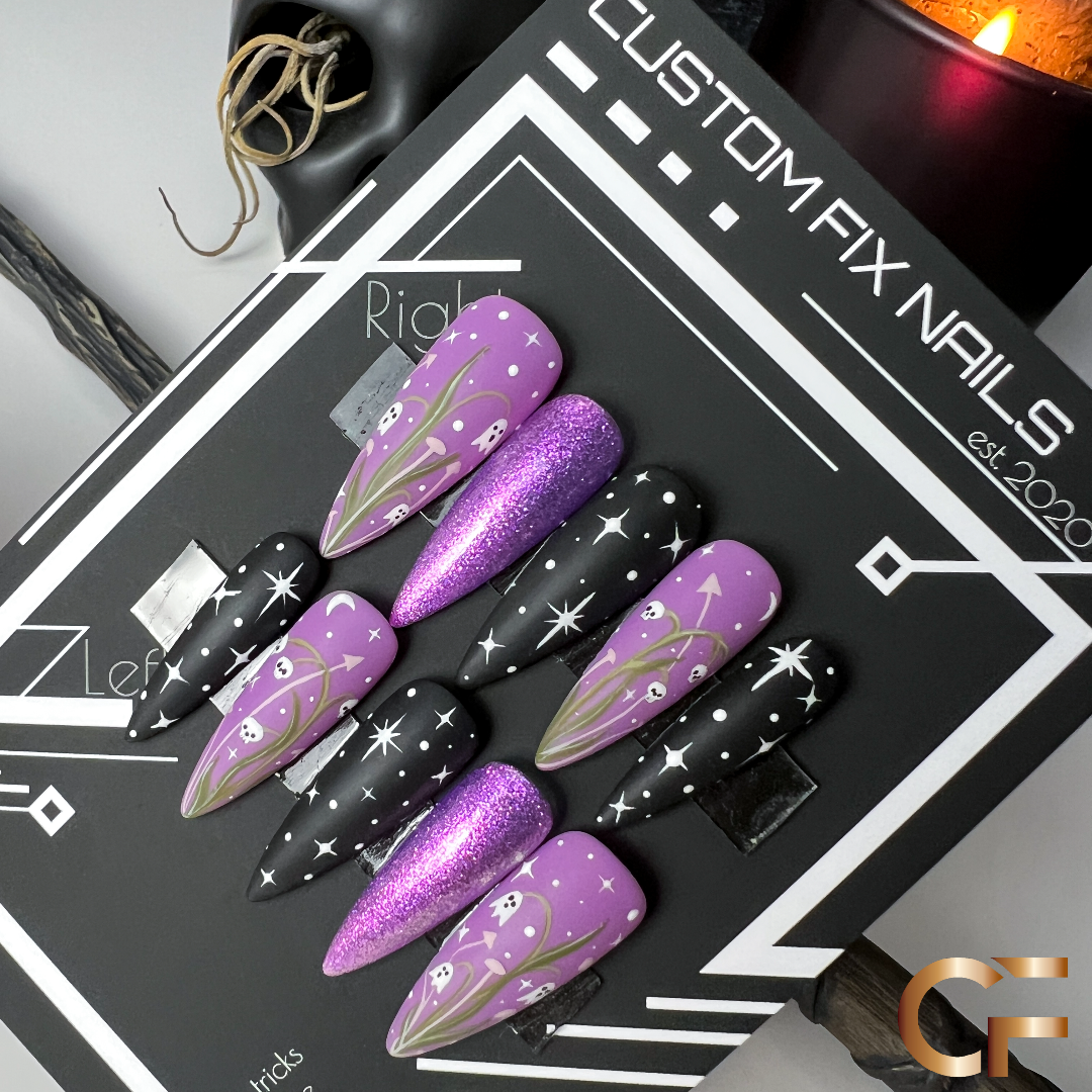 Okay, but before we start, THIS purple shimmer is INSANE! "Spooks" of the Valley is a fun twist on the cute little flowers Lily of the Valley. They are seriously so precious...and so are these little ghosties and skulls! And of course they have the sweetest little shroom friends next to them. Just adorable and electric all at once.