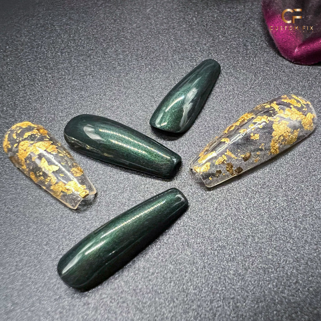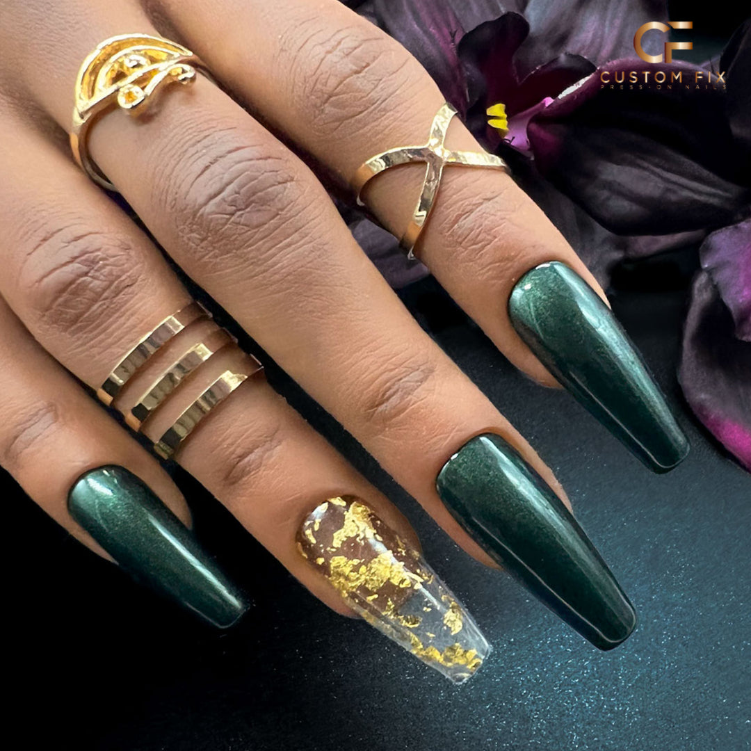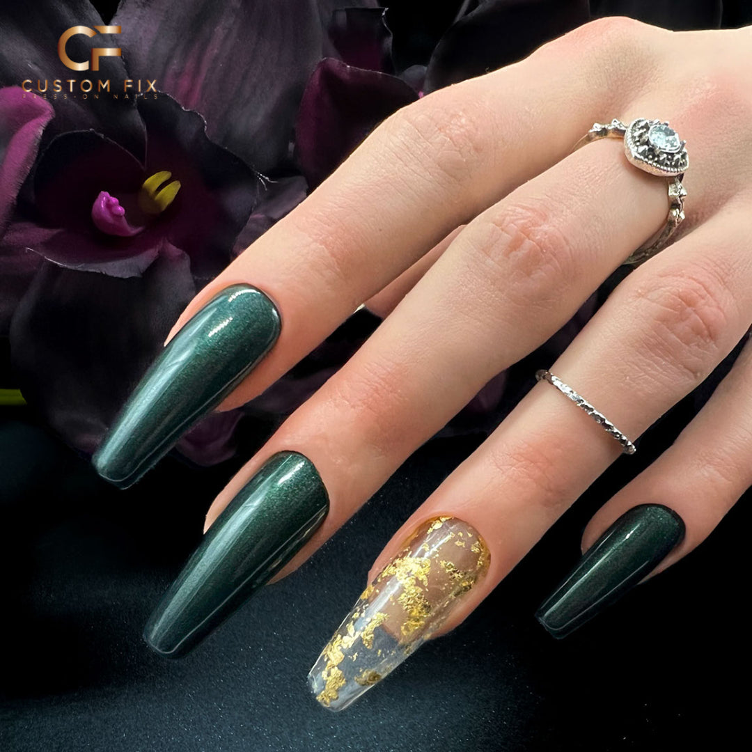 Such an enchanting Fix! I don't think I can explain how mesmerizing this shimmering emerald green is. You just get lost in it! And the cherry on top is that magnificent gold leaf layered on a clear nail!!