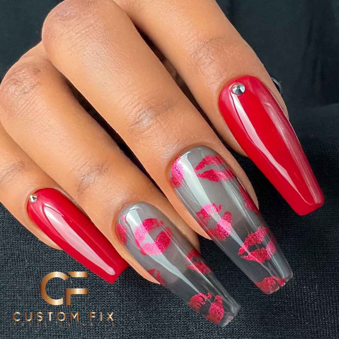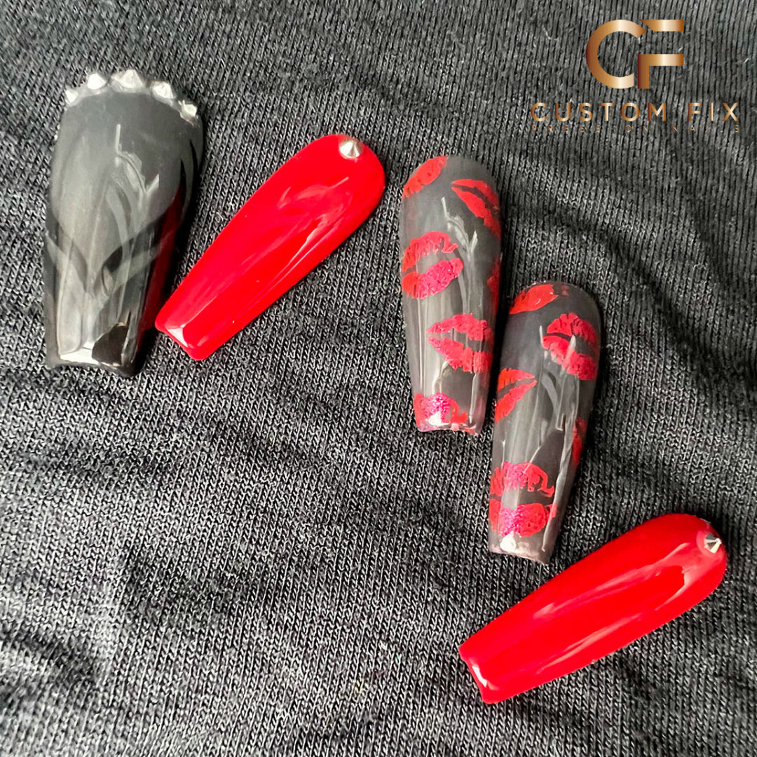 Your authentic self is a gift to this world. Don't deny it; embrace it, unleash it, and step into a bigger, bolder, brighter expression of it. A classic pairing of black and red with the raddest modern twist--super edgy with a feminine touch. Perfect glass black background, shimmering red lips, deep cherry red, coolest metallic crystals!
