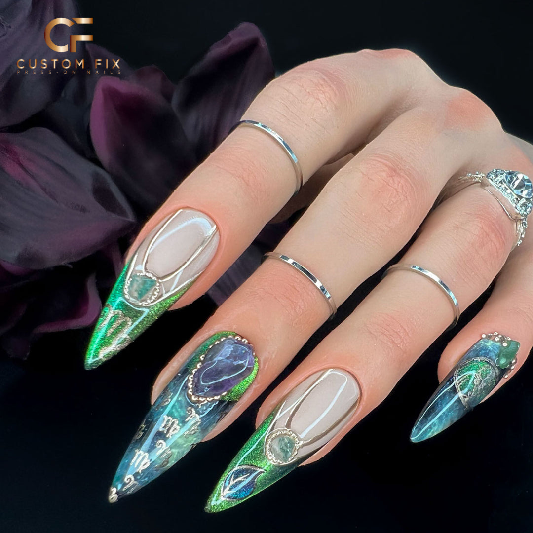 *Due to the added crystals, these nails may require a bit more care to maintain their sparkle. Such as, using a brush when washing your hands to remove any dirt that has gotten caught between crystal, gentle handling during application and removal is essential to prevent damage to the crystals, additionally, avoiding harsh chemicals and impact activities can help preserve the appearance.