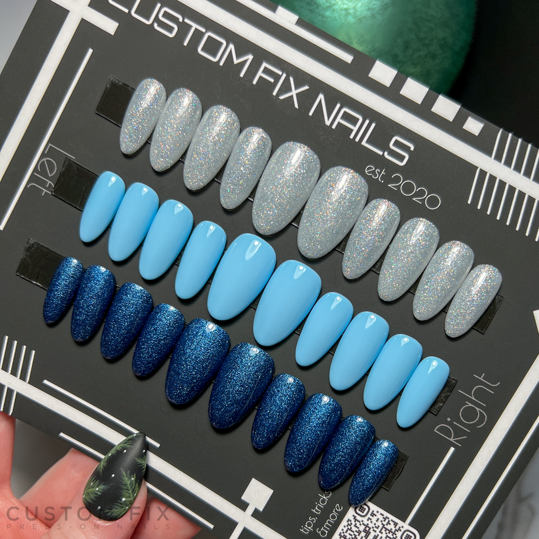 - Frozen: deep navy shimmer, bright pastel blue, a milky holographic silver