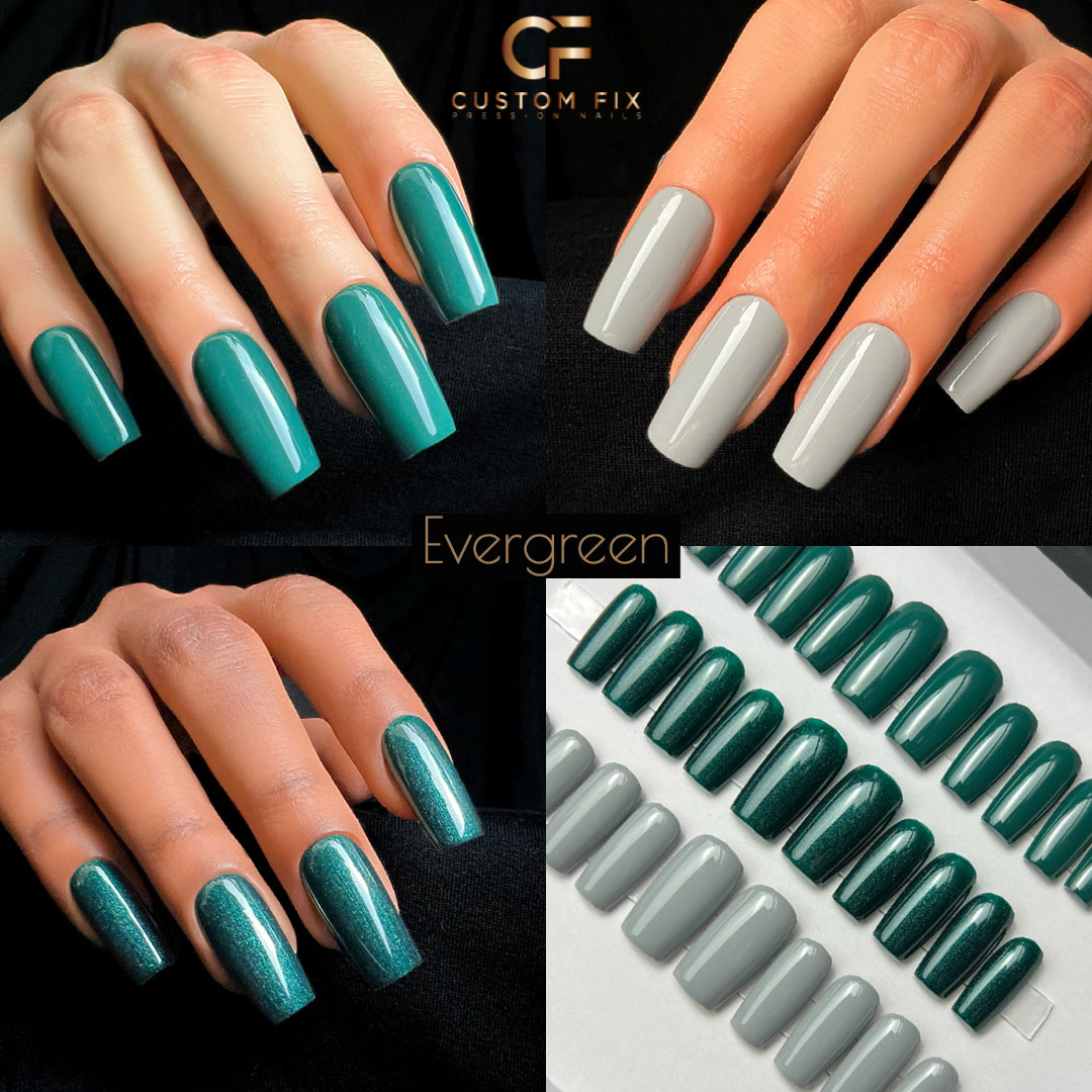 - Evergreen: medium gray, dark green/teal, and a rich dark green shimmer